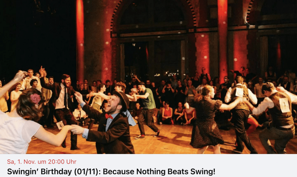 Absolutely! Swing Base hosts a variety of events throughout the year. During summer, we organize outdoor dancing at Wilde Renate, known as Renate Swing, every Tuesday. Here, you can attend swing classes and enjoy outdoor concerts. We also host several special events like Knall auf Ball im Säälchen and the festive Christmas Ball at the French Institute. Make sure to check our events schedule regularly for updates!